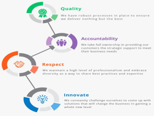 Safety - we strive for accident-free projects. |Professionalism. |Integrity (Honesty, Trust and Respect) | Attitude | Team Management (with Shared Responsibilities) | Open and Free Com- munication | Quality | Inclusion |Accountability |Customer Satisfaction.